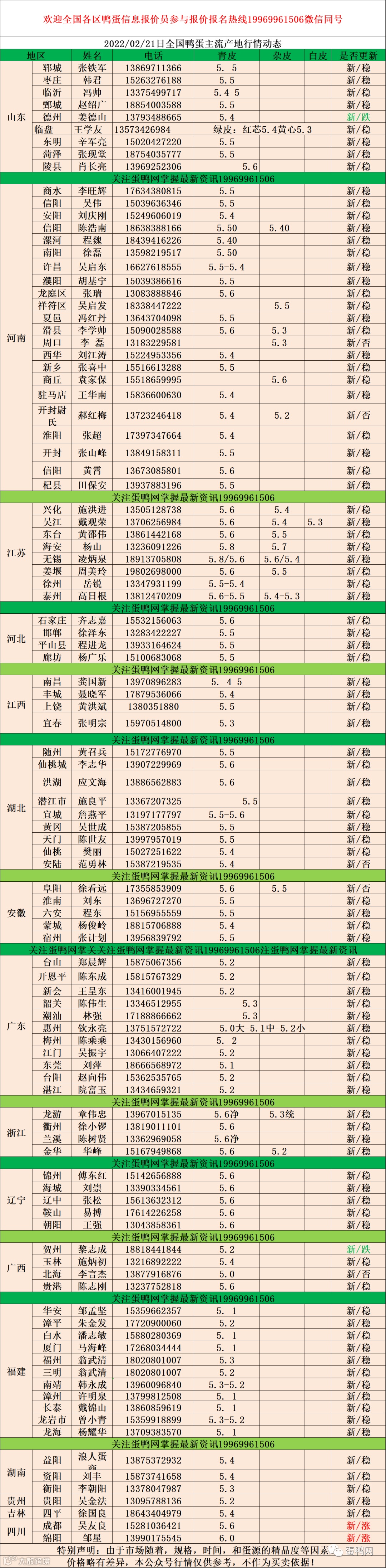 2022年02月21日鲜鸭蛋价格:初产至10个头5.0元 。 10个头至9个5.2元。9个至7个半5.4元。7个半至7个头5.5元,足7个头5.6元(鸭蛋价格仅供参考)。