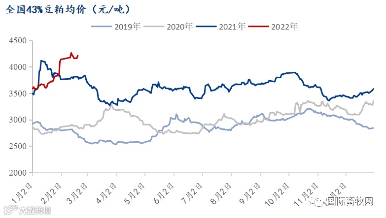 据Mysteel农产品数据显示,截至2月17日,全国43%豆粕现货均价为4214元/吨,年内累计上涨669元/吨,涨幅18.87%。折算至饲料中,每吨饲料成本增加114-134元。