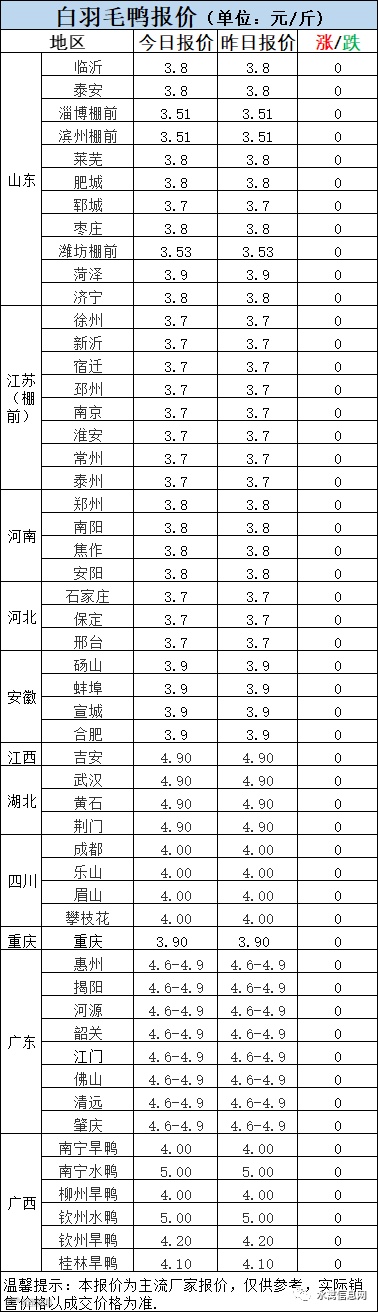 今日鸭苗报价连续下滑,北方下调0.4元/羽,南方下调0.3元/羽。