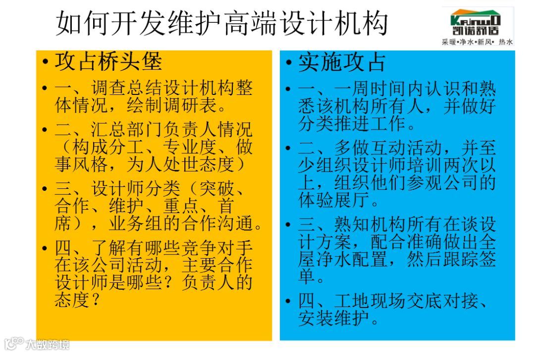 除了小区团购,另外一个重点我觉得是与高端设计和装修公司的合作,现在用户对居室环境要求越来越高,大家在装修过程中都想突出自己的个性和品味,设计师在设计方案中植入全屋净水的概念,从而提升用户的选购机率。这在前期也是非常关键的。