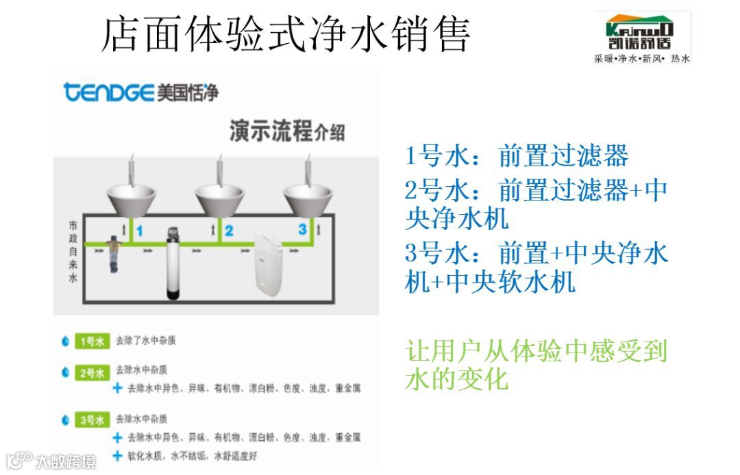 做好销售必须要有好的产品,同时店面、展厅必须配套好的硬件和软件设施,便于水质数据分析和客户数据分析的同时,客户也会对产品有很深的了解和认知,我们不需要用太多的语言对客户进行描述,客户看到的就是最终的结果。