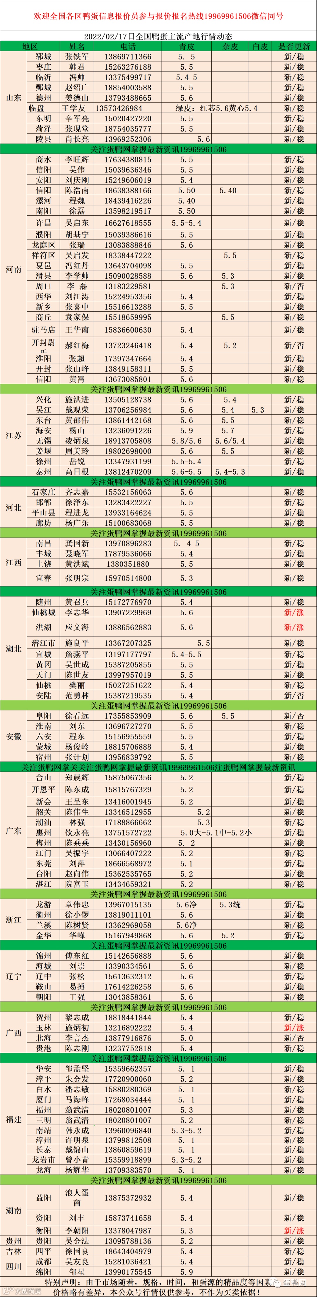2022年02月17日鲜鸭蛋价格:初产至10个头5.0元。10个头至9个5.2元。9个至7个半5.4元。7个半至7个头5.5元,足7个头5.6元(鸭蛋价格仅供参考)。