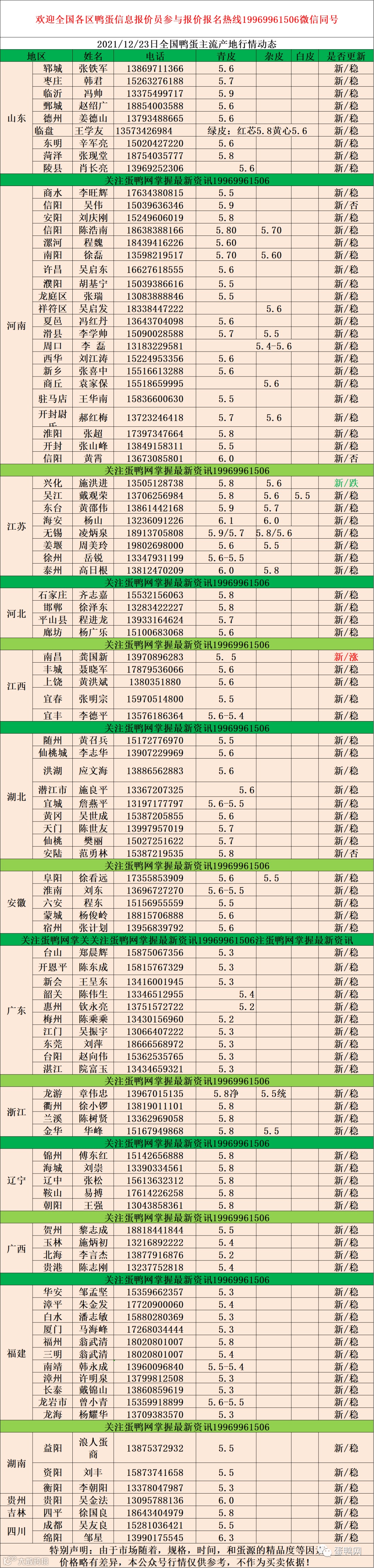 2021年12月23日鲜鸭蛋价格:初产至10个头5.0元 。 10个头至9个5.2元。9个至8个5.4元。8个至7个半5.6元,7个半至7个头5.7.元足7个头5.8元(鸭蛋价格仅供参考)。