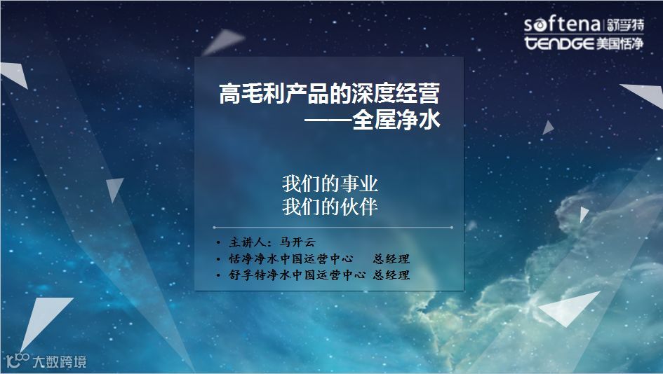 接下来开始我的主题演讲,我的演讲题目是《高毛利产品的深度经营——全屋净水》。