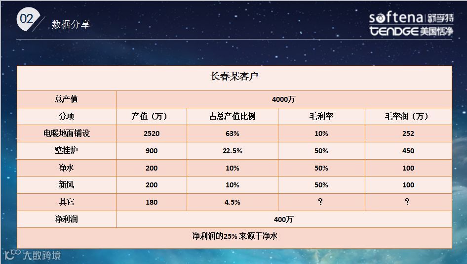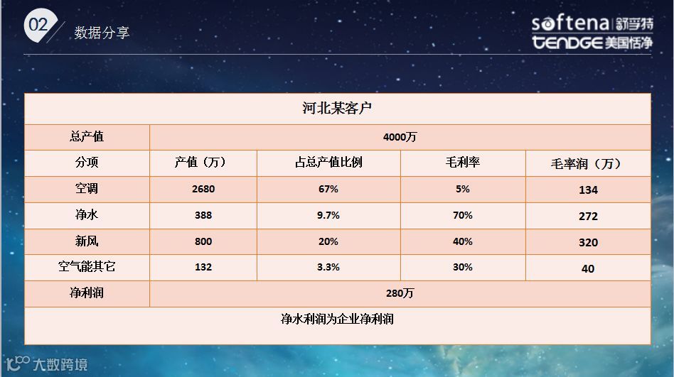 我们河南的一个客户,它的净利润是260万,净水产值比为7%左右,净水的毛利贡献是200万;一个河北客户,产值占比9.7%,272万的毛利润;一个长春的客户,净水大概占比10%,毛利率50%,毛利贡献100万。
