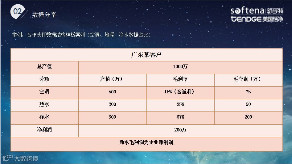 我的一个广东客户,一年做1000万,空调200万、净水500万、热水200万,整个公司大概11个人,一年的净利润是200万。这个公司是以净水为主的企业转型后的企业,为什么要转型呢?因为他觉得面对当前客户对空调和热水的多样化需求,单纯做一项是不够的。所以舒适家居的盈利模式是有一定竞争性的,净水一年卖300万,价格也比较高。