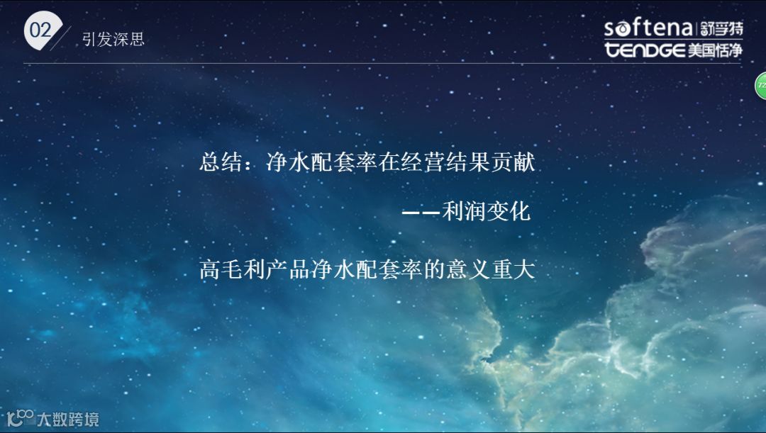 总结净水配套率在经营结果贡献、利润方面的变化,高毛利产品意义重大。市场背景方面我觉得净水产品体系已经非常重要了,恬净的品质过硬,我们拥有13年的产业能力,有很好的经营能力、价值导向和帮扶体系,能够和我们的合作伙伴走远、走深。