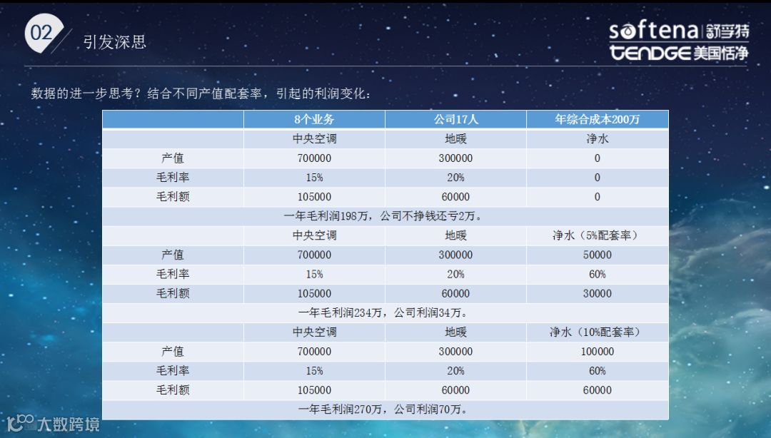 第三,净化体系的净利润贡献额现在很高,其实舒适家居企业里面很多都是10个销售人员,我跟他们讲,一个销售人员一个月卖一万,全年下来净水可以多赚几十万。还有另外一组数据,是我亲身经历的,在2007~2008年,我们公司一个销售人员,一个月能卖10万,我个人在那个年代,一个月可以卖20万的净水。难道现在舒适家居的销售员真的那么差吗?一万都卖不出去?不是的,是因为你没有掌握方法!