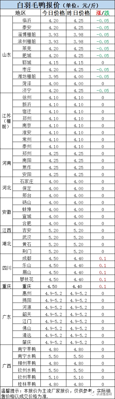 1:今晚北方毛鸭报价超涨调整,整体趋弱,山东普遍下滑。