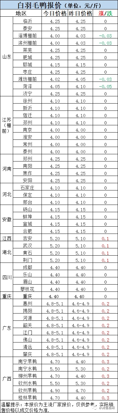 1:今晚北方毛鸭报价涨后维稳,局部波动调整。山东棚前下滑。