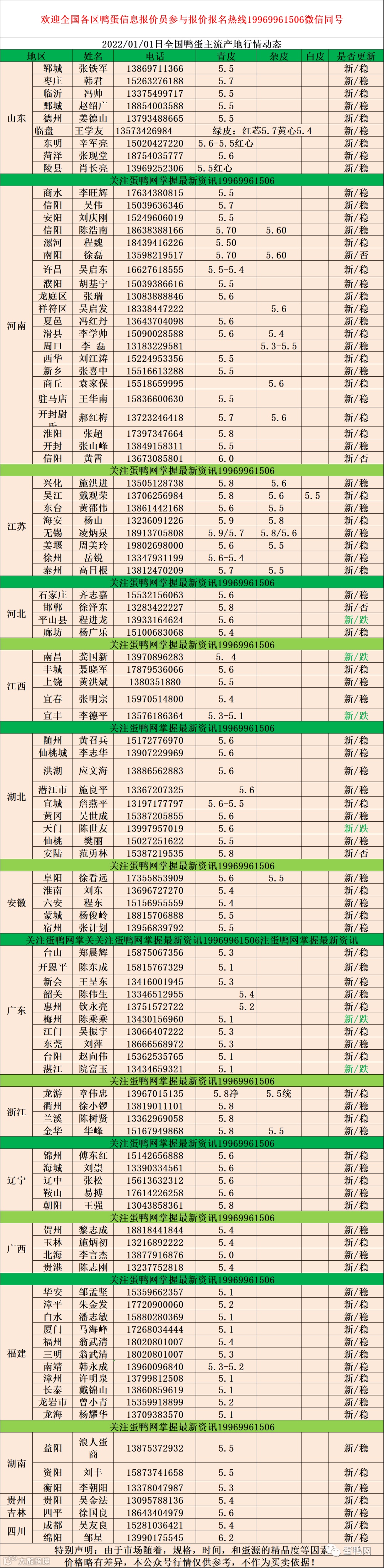 2022年1月1日鲜鸭蛋价格:初产至10个头5.0元 。 10个头至9个5.2元。9个至7个半5.4元。7个半至7个头5.5元,足7个头5.6元(鸭蛋价格仅供参考)。