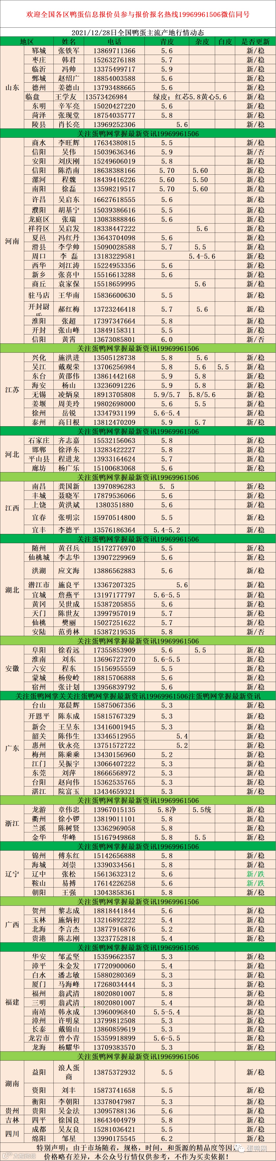 2021年12月28日鲜鸭蛋价格:初产至10个头5.0元 。 10个头至9个5.2元。9个至7个半5.4元。7个半至7个头5.5元,足7个头5.6元(鸭蛋价格仅供参考)。