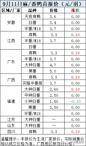 一、9月10日晚至9月11日 白羽肉鸭报价