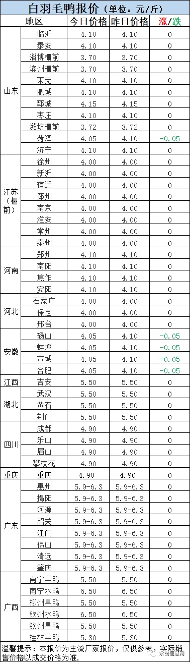 1:今晚北方毛鸭报价整体稳定,局部追跌。冷藏高成本运行,冻品旺季不旺,走货慢,产品报价节节下滑,对毛鸭支撑仍薄弱。