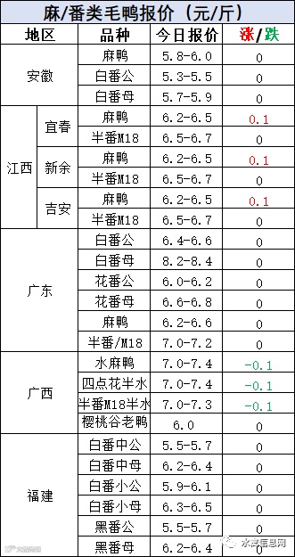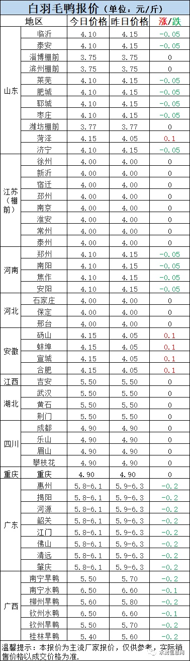 1:今晚北方毛鸭报价涨跌不一,山东、河南下滑0.05元/斤,安徽上涨0.1元/斤。冷藏高成本运行,冻品旺季不旺,走货慢,产品报价节节下滑,对毛鸭支撑仍薄弱。