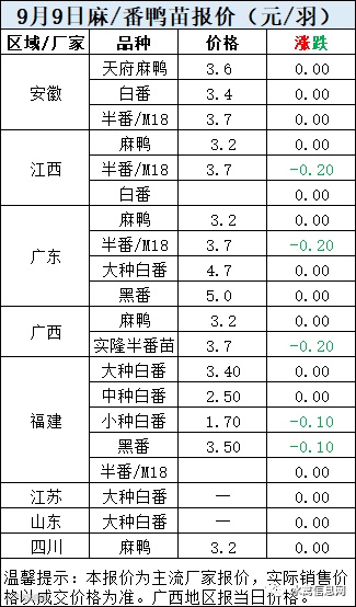 一、9月9日白羽鸭苗报价