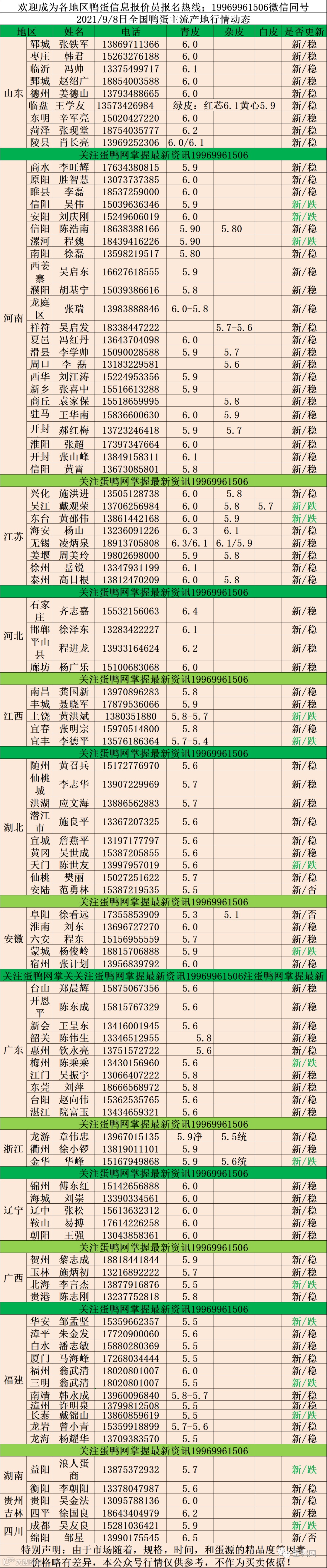 2021年9月8日鲜鸭蛋价格:初产至10个头5.2 元 10个至9个头5.6 元,9个至大蛋6.0元。
