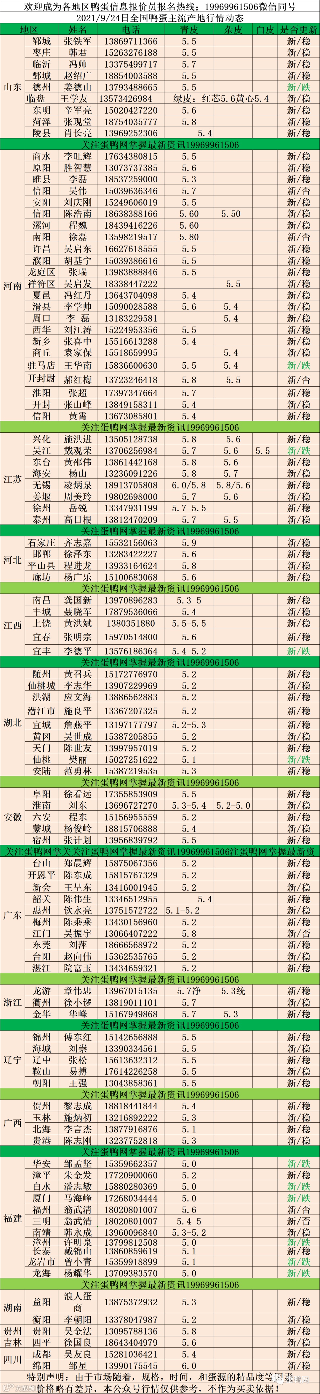 2021年9月24日鲜鸭蛋价格:初产至10个头5.0元 。 10个至9个头5.3 元, 9至8个头5.4 。8个头至大蛋5.5元(鸭蛋价格仅供参考)。