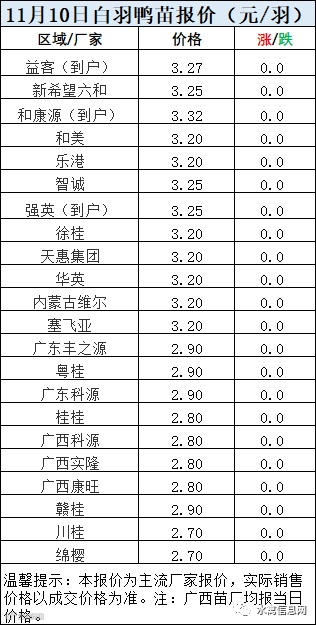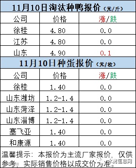 一、11月9日晚至11月10日 白羽肉鸭报价