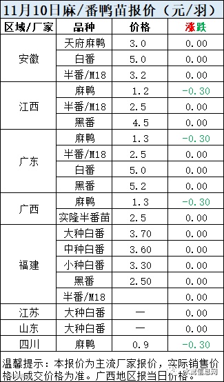 深秋补栏减少,麻番鸭苗弱势下滑。