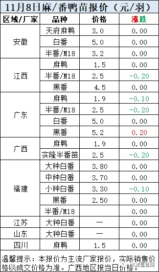 明日麻鸭苗报价广东下滑0.1元/羽,其他区域稳定。半番鸭苗报价下滑0.2元/羽。