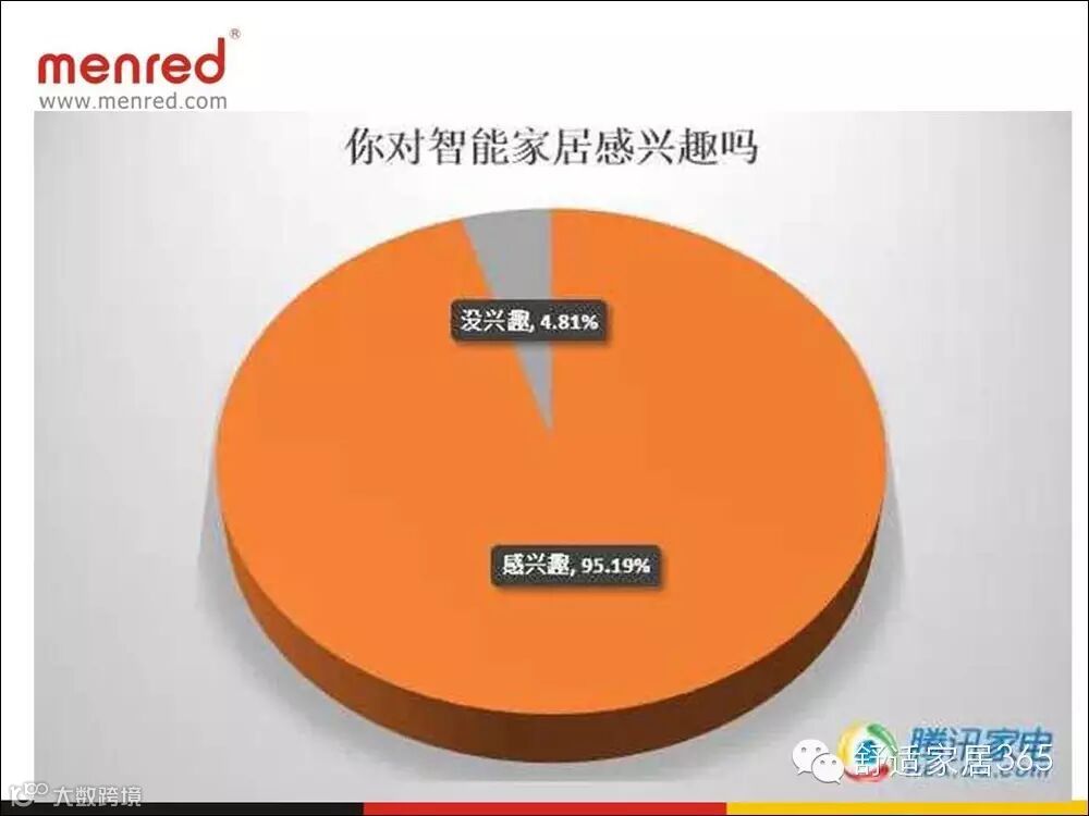 既然家居智能系统需要瘦身,那么智能家居系统的前路在哪里?是“轻”家居智能(为了某一个功能独立存在的,智能插座、传感器、网络摄像头)或者是 “重”家居智能(系统集成化方案提供商)?是万物WiFi还是各展所长?为此,林晨分享了一个针对50000人的调查问卷。问卷结果显示,结果显示对智能家居感兴趣的人数占95.19%;没兴趣的人数占4.81%。