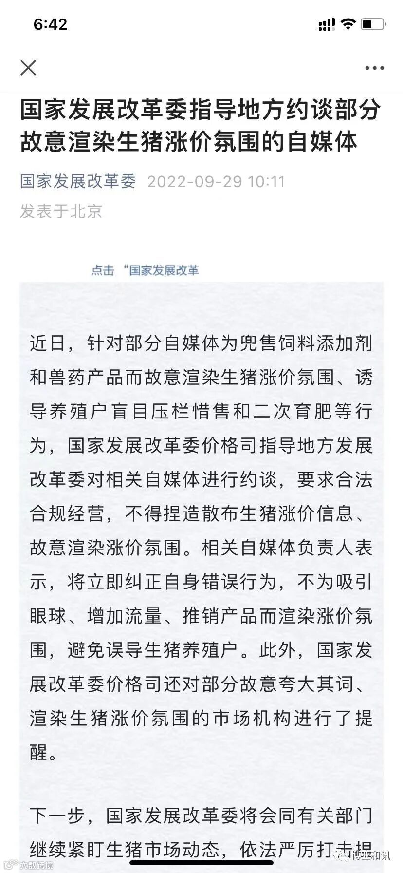 9月29日,国家发改委官方微信公众号消息显示,近日,国家发改委价格司就部分自媒体为兜售饲料添加剂和兽药产品而故意渲染生猪涨价氛围、诱导养殖户盲目压栏惜售和二次育肥等行为,指导地方发改委约谈相关自媒体,要求其合法合规经营,不得捏造散布生猪涨价信息、故意渲染涨价氛围。
