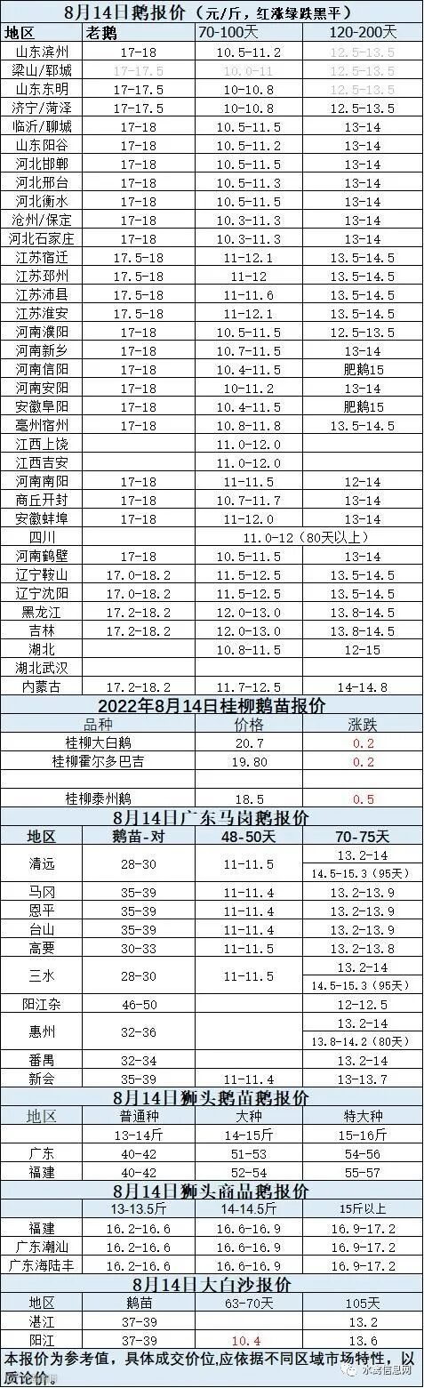 2022年8月14日鹅种蛋价格(元/枚)部分停报