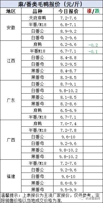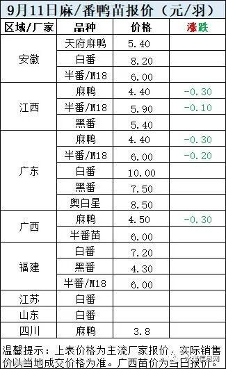麻鸭苗报价下滑0.3元/羽,半番鸭苗报价下滑0.1元/羽。