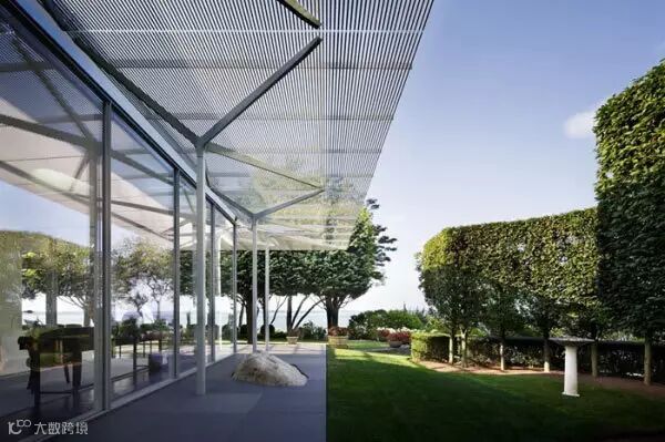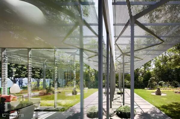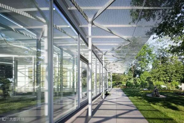 细长的铝棒水平窗与树林一同过滤光线,