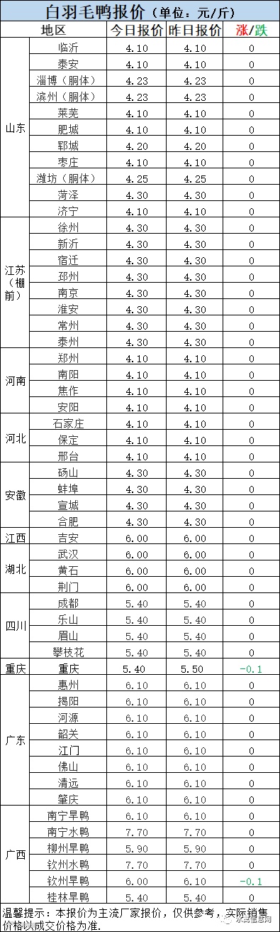 鸭苗报价全线走弱,明日北方鸭苗下滑0.3元/羽。南方鸭苗趋稳,江西下滑0.2元/羽。