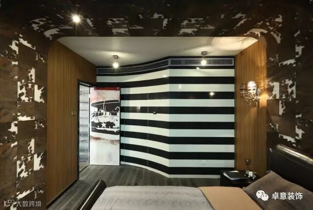 床被毛皮质感的壁纸半包围着,很有私密感和安全感