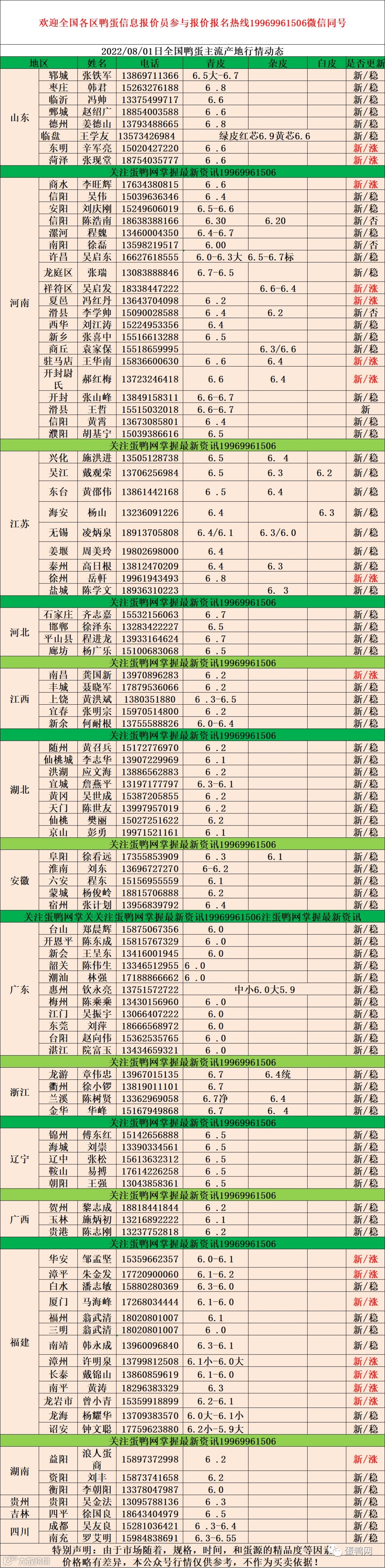 2022年8月1日鸭蛋报价