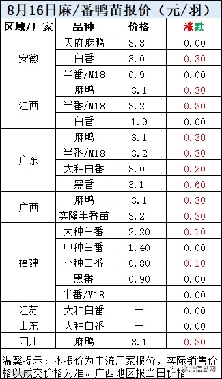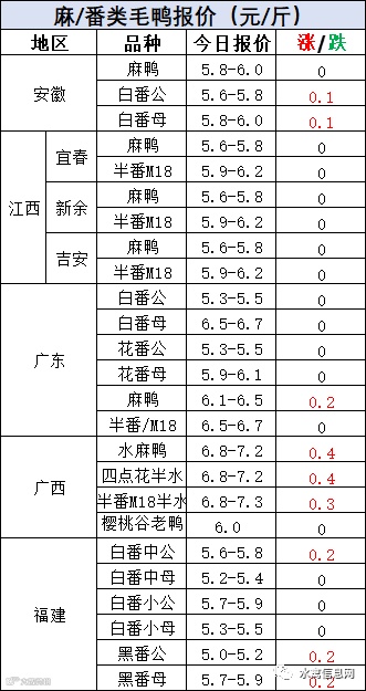 明日麻鸭苗报价上涨0.3元/羽,半番鸭苗报价上涨0.3元/羽。