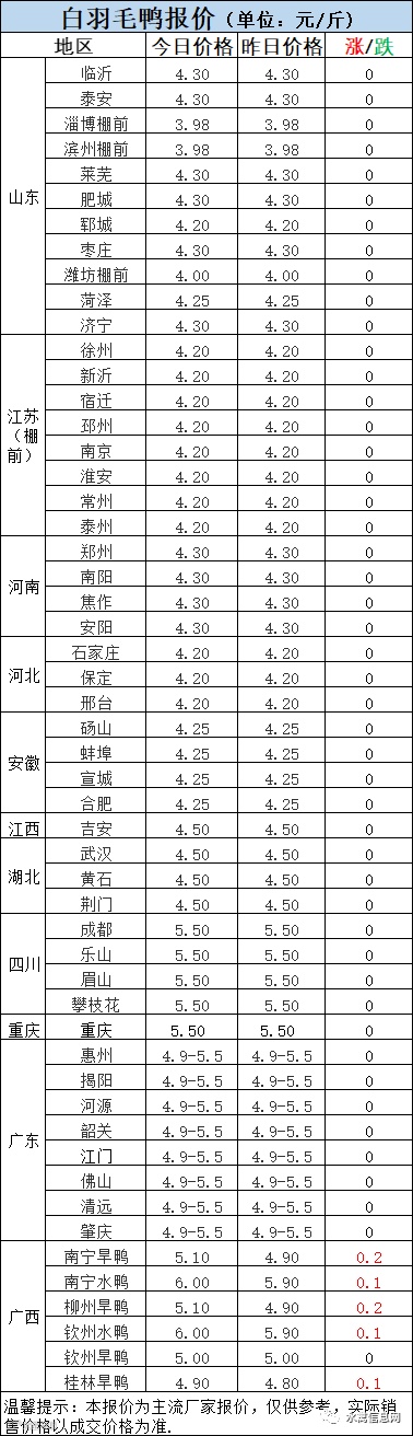 今日淘汰鸭报价局地上涨,受疫情影响,毛鸭价格震荡调整。