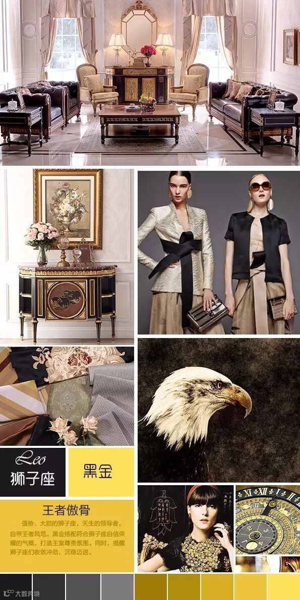 时尚尊贵黑金搭配符合狮子座自信荣耀的气概,黑棕色头层牛皮扪包沙发配以手工描金装饰柜,打造出王室尊贵氛围,