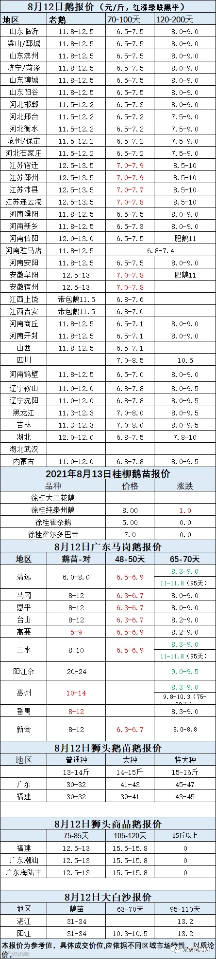 2021年8月12日鹅种蛋价格(元/枚)停报