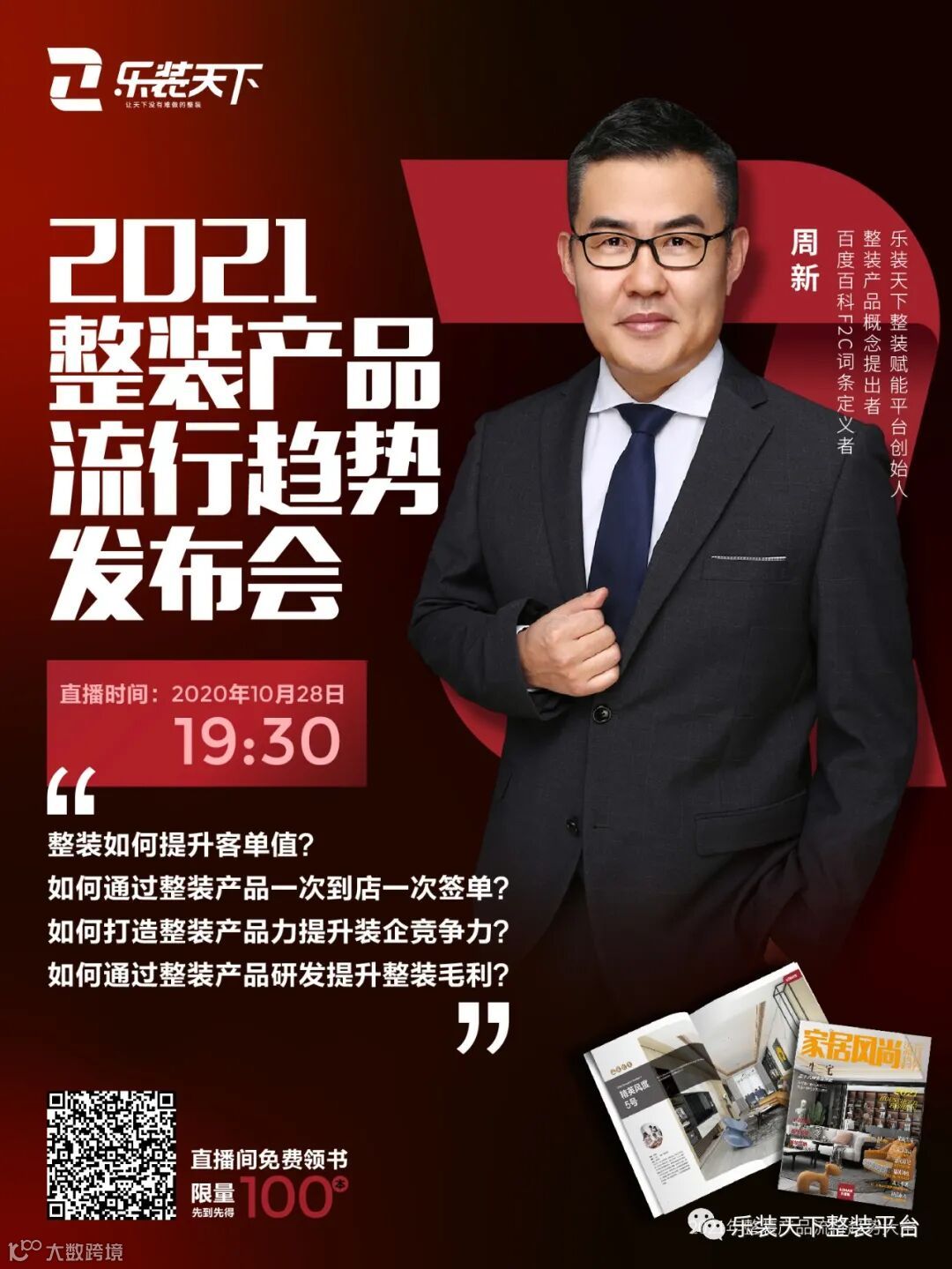 整装如何提升客单值?如何通过整装产品一次到店一次签单?如何打造整装产品力提升装企竞争力?如何通过整装产品研发提升整装毛利?明天10月28日周三晚上19:30,乐装天下整装赋能平台创始人周新先生亲临直播间,为大家带来2021整装产品流行趋势发布会!