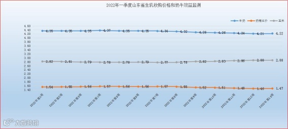 2、养殖收益:2022 年第一季度我省奶价呈现高位回落态势,一季度我省生鲜乳平均交售价格为 4.23 元/公斤,环比降 低 1.63%,同比降低 1.17%;按月度监测来看,1-3 月份我省 生鲜乳平均交售价分别为 4.32、4.26、4.12 元/公斤。第一季 度奶粮比价均值为 1.51,环比降低 1.31%,同比升高 2.68%, 一季度奶牛养殖收益低于去年四季度,但略高于去年同期。