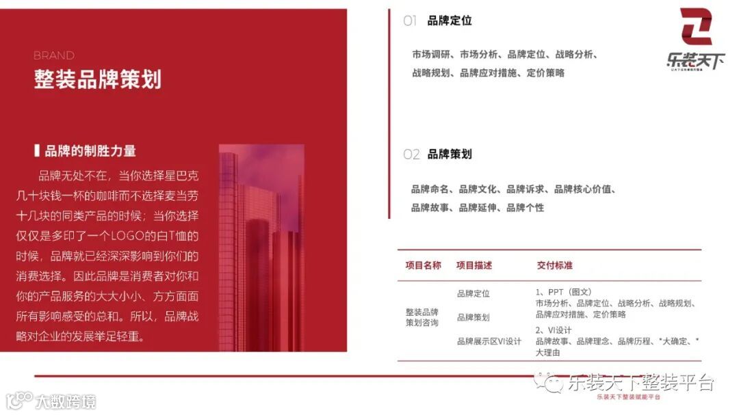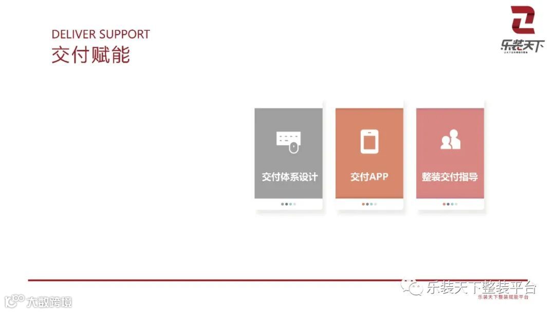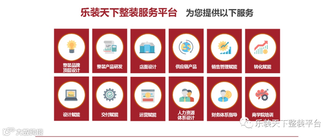 乐装天下是乐豪斯集团旗下整装赋能平台,利用乐豪斯十余年的整装实践经验,积累出整装品牌策划、整装产品研发、整装供应链、运营系统、软件系统、交付系统等一整套可复制的整装体系,通过服务+系统+产品帮助整装公司成为当地数一数二的整装品牌。