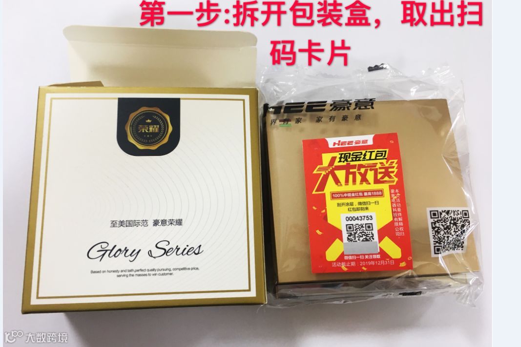 一、收到豪意荣耀86系列五孔(118系为二位边框)产品后,拆开包装盒就会看到一张扫码领红包的卡片。
