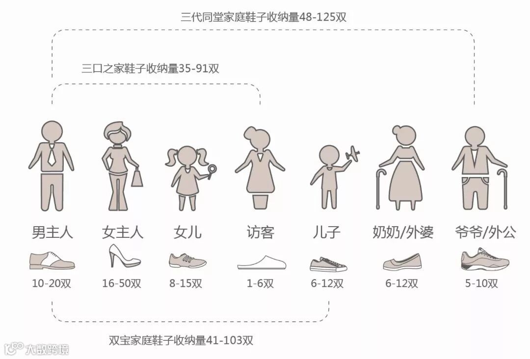 拿鞋子来说,家庭中男女主人以及老人或小孩的收纳需求是不一样的,因家庭成员的年龄以及职业不同,鞋子收纳的特点也不一样。