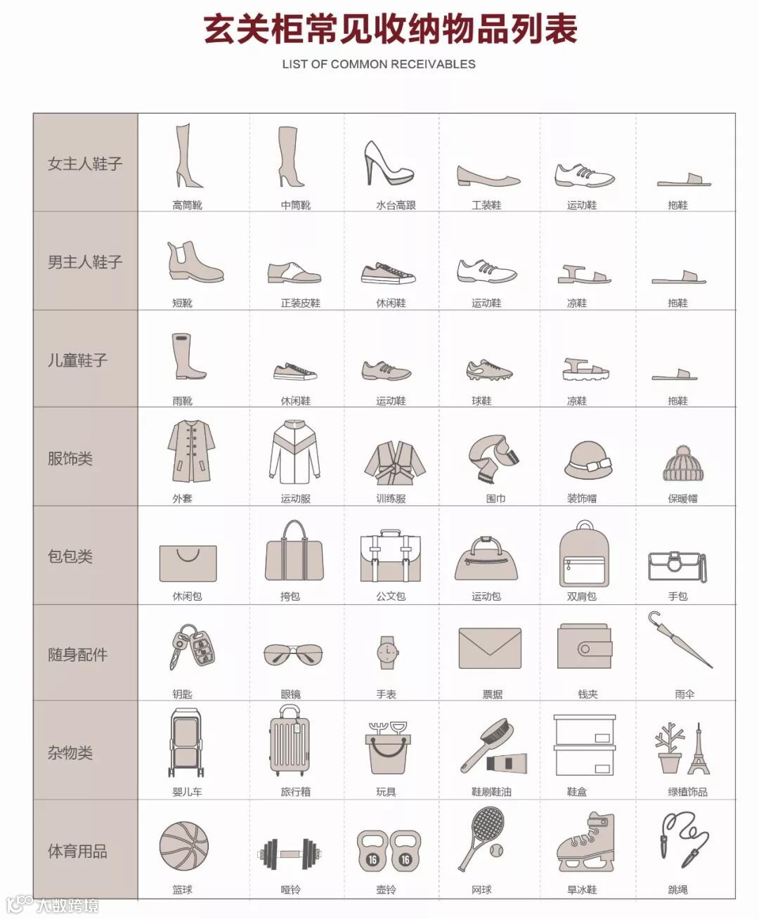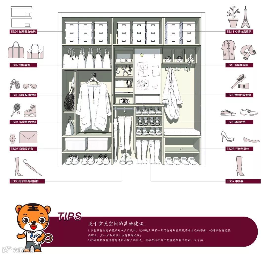 从上图可以看出,一个家庭对于鞋子的收纳需求是很惊人的,还有平时出门需要带的眼镜、手表、钱包、钥匙、包包等都需要进行规划收纳位置。