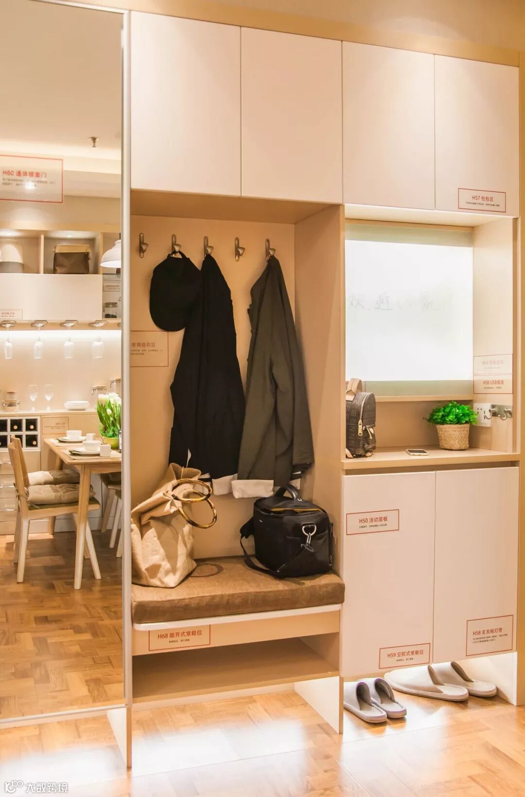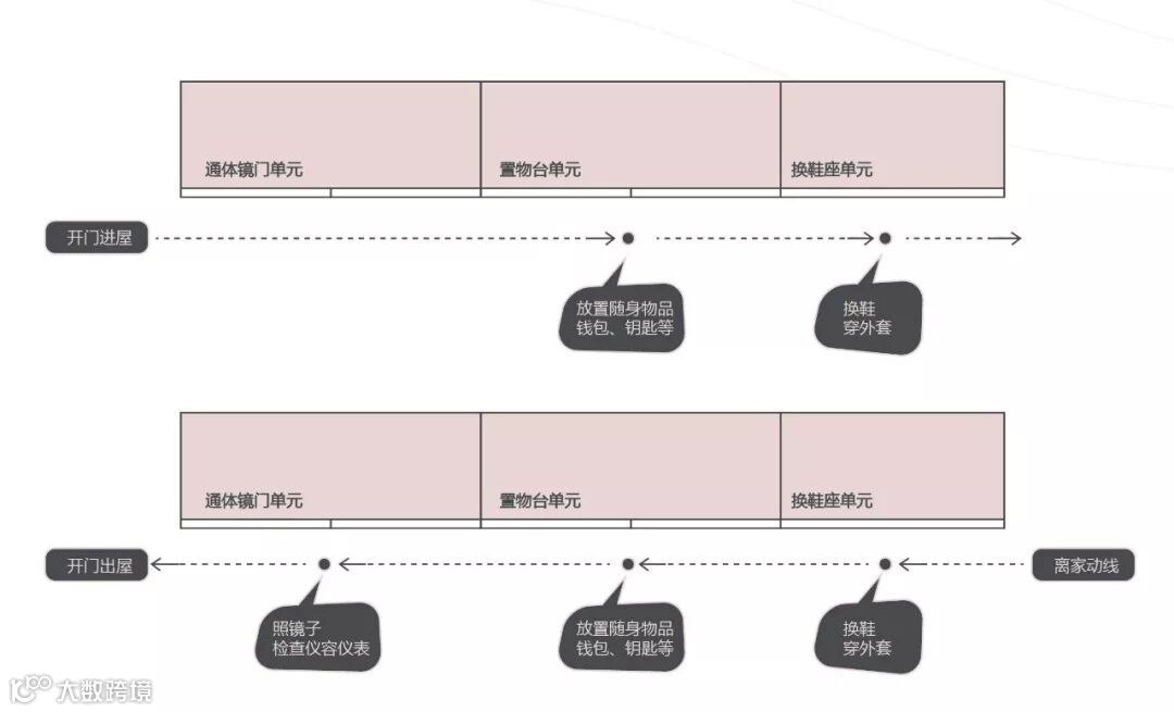 玄关动线决定功能布局,玄关动线有回家和离家两种模式:忙完一天在打开家门,放下钥匙、包包,换上拖鞋,脱掉外套,挂上外套之后,走进舒适的客厅;清晨坐在换鞋座上换完鞋,穿上外套,佩戴随身的钱包、钥匙等,站在镜子面前给自己一个自信的微笑,走出家门。