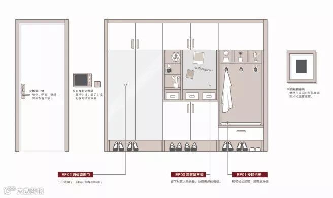 玄关是出门更衣换鞋,回家临时放下买回来的各种生活用品、食材等多功能空间,收纳鞋子、手提包、雨伞、钥匙、衣物等,方便更换鞋子并便于清理,玄关的设计对每一天的进出门的便利性影响很大,甚至影响一天的心情。