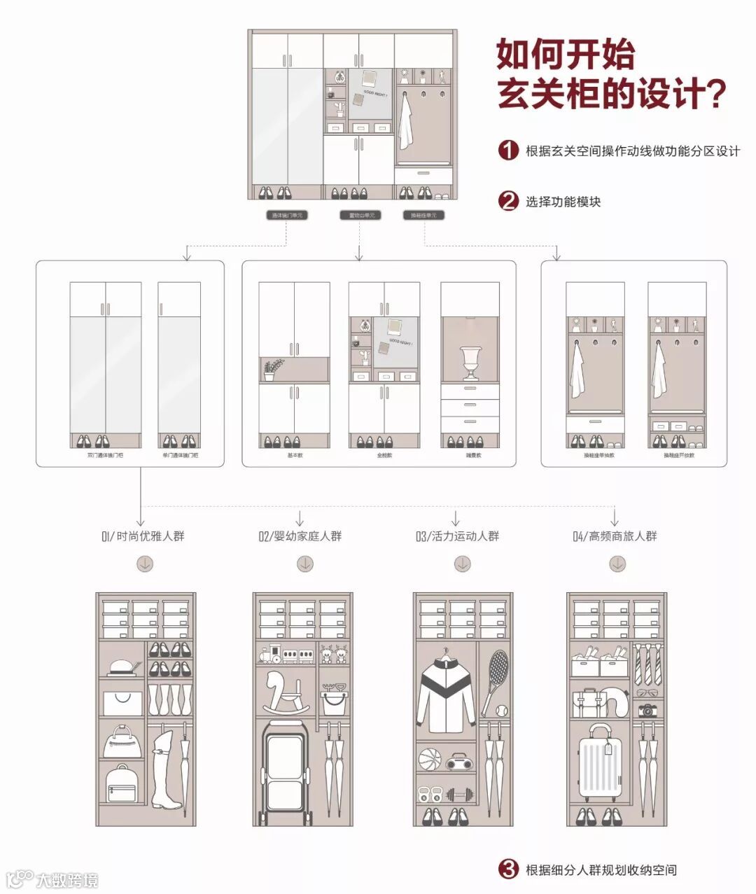 玄关功能需要根据动线进行规划,主要体现在玄关柜的设计上: