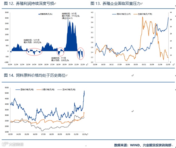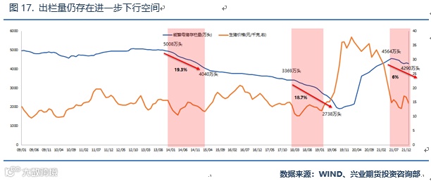 从历次猪周期表现来看,猪价的反弹都伴随着生猪的产能出清,且去化幅度基本上在20%左右。2014-2015年期间,能繁母猪存栏量自5008万头下降至4040万头,降幅达到19.2%;2018-2019年期间,能繁母猪存栏量自3369万头下降至2738万头,降幅达到18.7%。但截止2022年2月,能繁母猪存栏量仍有4290万头,较高点4564万头仅下降了6%,产能去化程度大幅不及前两轮。而从时间上来看,前两轮去化时间通常在1年-1年半,而本轮存栏量见顶发生在2021年中,至今不足10个月。因此不管是从时间还是空间上,生猪存栏均存在进一步去化空间。