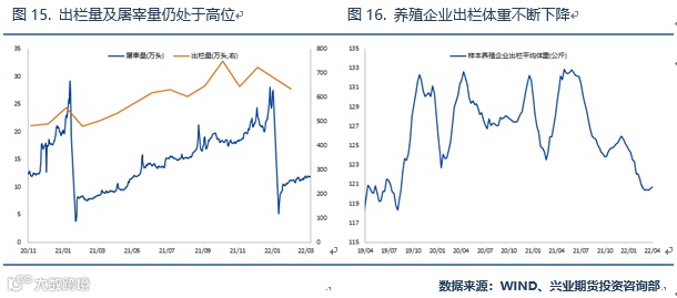 生猪价格方面,存栏量、屠宰量等同步指标仍维持在相对高位,猪肉供给相对充裕。而在出栏方面,由于养殖行业深度亏损的状态,目前养殖企业的生猪出栏体重也正在持续下降,也印证了养殖户出栏意愿较强、补栏意愿不佳的情况,因此短期内猪价大概率将继续承压。在猪价下跌和饲料上涨的双重压力下,生猪养殖企业的资金压力预计将进一步增加,这将促使行业产能持续去化。