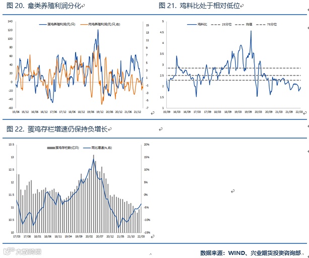 禽类方面,从养殖利润的角度来看,目前肉鸡和蛋鸡略有分化,肉鸡养殖利润仍维持在亏损状态,而蛋鸡则受到鸡蛋价格较为坚挺的影响,养殖小幅盈利,但利润情况一般,处于历史相对低位。此外同样受到饲料成本大幅抬升的影响,鸡料比目前正处于显著低于25分位的水平。从存栏量上来看,目前蛋鸡存栏量正处于历史低位,且在低利润情况下存栏量仍可能出现进一步下滑,因此预计禽类养殖难以对饲料形成较为明显的需求支撑。