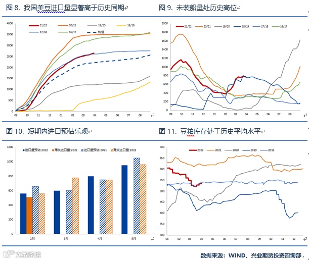 从目前我国大豆进口情况来看,虽然南美大豆受产量影响出口量有所下降,但我国从北美大豆进口量处于历史较高水平。截止3月31日当周报告数据显示,21/22年度我国累计进口美豆达到了2657.86万吨,高于过去5年均值2226.43万吨,此外当周未装船量达到了779.5万吨,为过去5年的最高值。目前市场对于4月和5月的进口量预估分别为800万吨和950万吨,与去年基本持平。而从库存水平来看,若将大豆按0.78的压榨比例进行折算,目前国内豆粕库存整体处于历史平均水平,因此在进口量大概率表现平稳甚至可能略好于预期的情况下,国内豆粕暂时并不存在明显的供给短缺情况。